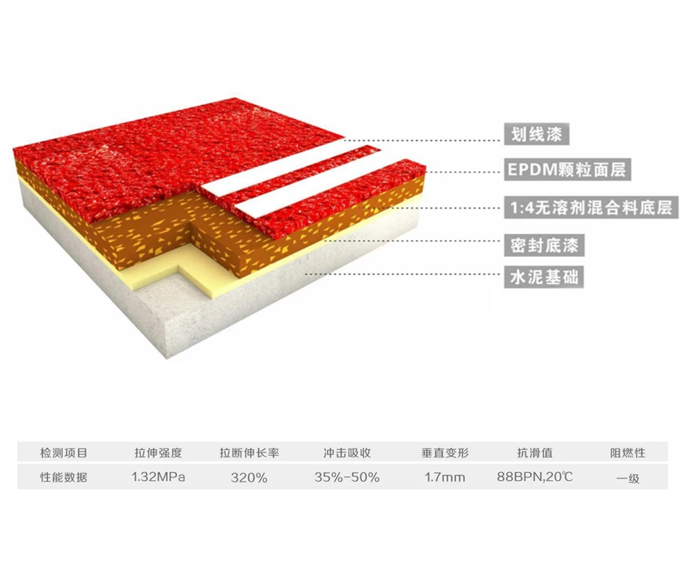 混合型塑胶跑道采用PU/EPDM颗粒面层,弹性耐磨防滑,符合国际赛事标准。全PU母体掺橡胶颗粒,高强度且施工简便,是优选体育地面材料。